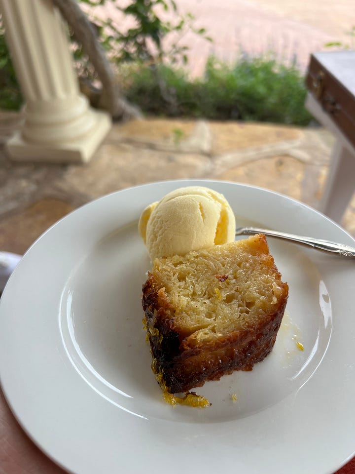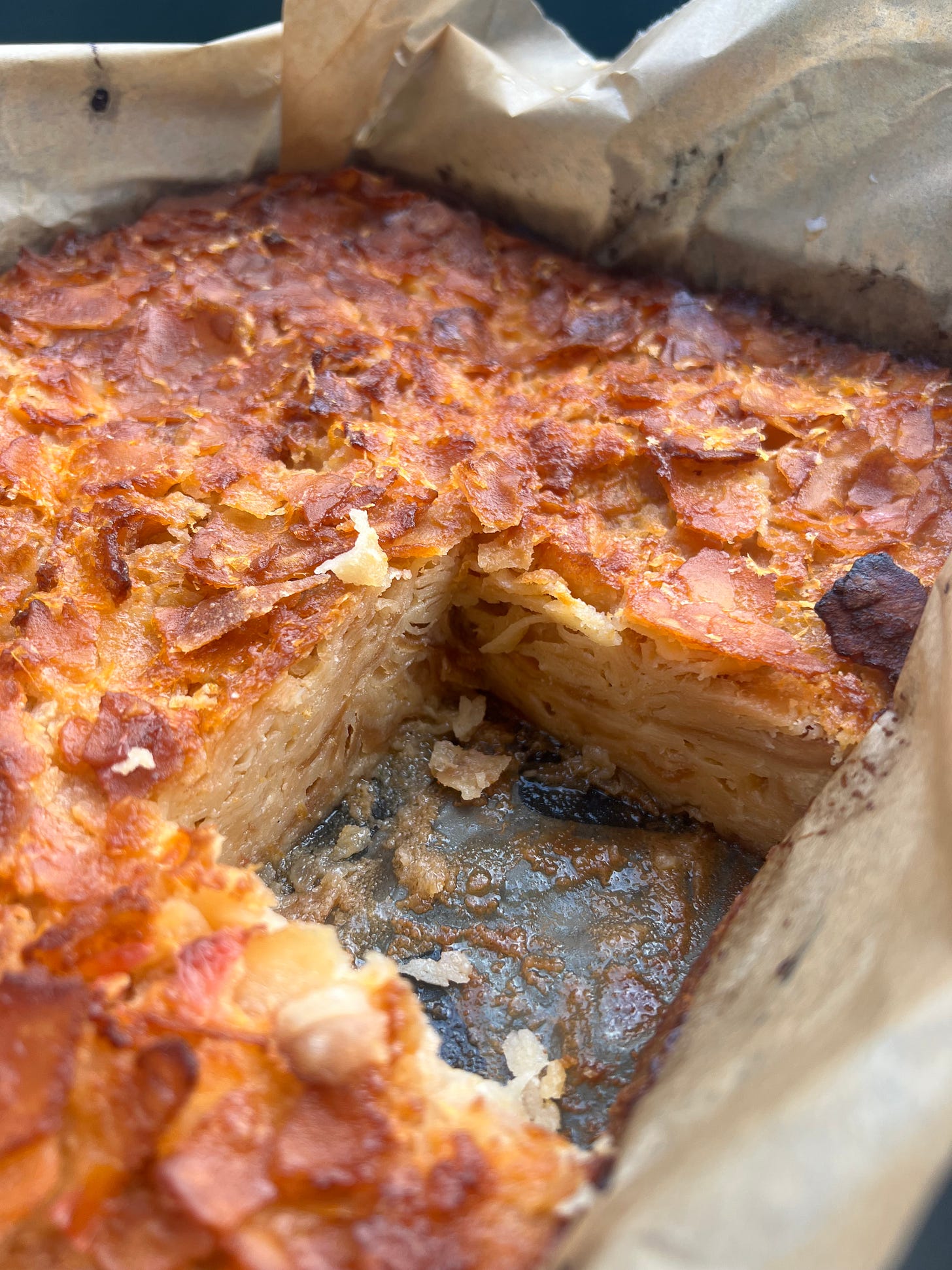 The literal translation is orange cake, it was created as a way of using leftover dried bits of filo, as filo is a big part of the cuisine so there’s often leftover bits hanging about. The dried bits are crumbled into a custard mix, then baked and drizzled with a syrup when hot out the oven. It then benefits from sitting and being stored in the fridge for consumption in the days after. It originated in Crete, like quite a few Greek desserts it does tend to be on the sweet side.