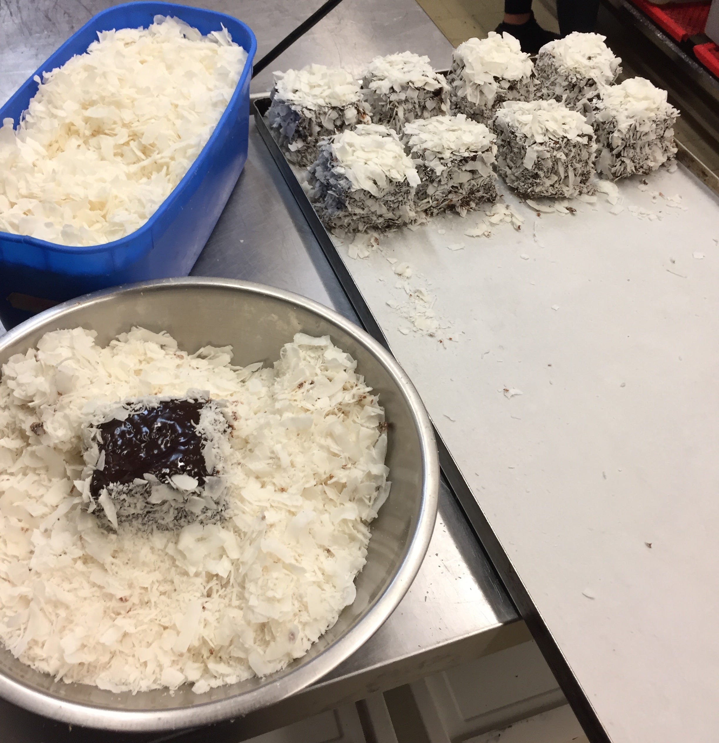 So on to an absolute Australian classic the lamington, I feel like everyone knows a lamington although we don’t have them much in London they are instantly recognisable from the cube shaped coconut covered appearance. The first time I tackled a lamington was when I did a stage at the Sydney bakery Flour and Stone back in 2018. A lovely bakery run by Nadine Ingram, they have the clever twist of soaking their lammy sponges in panna cotta giving them a soggy in a good way texture, sandwiched with jam and covered in chocolate and a mix of flaked and desiccated coconut, tres delicious.