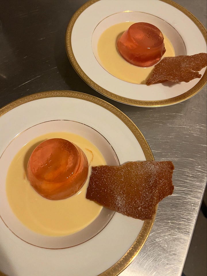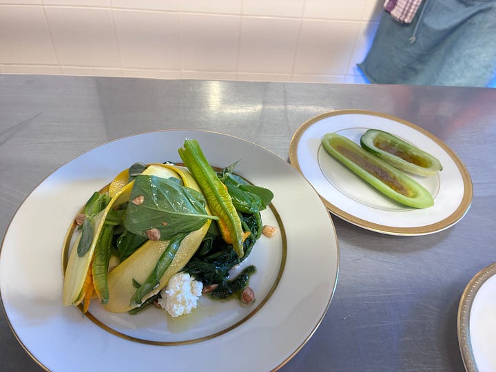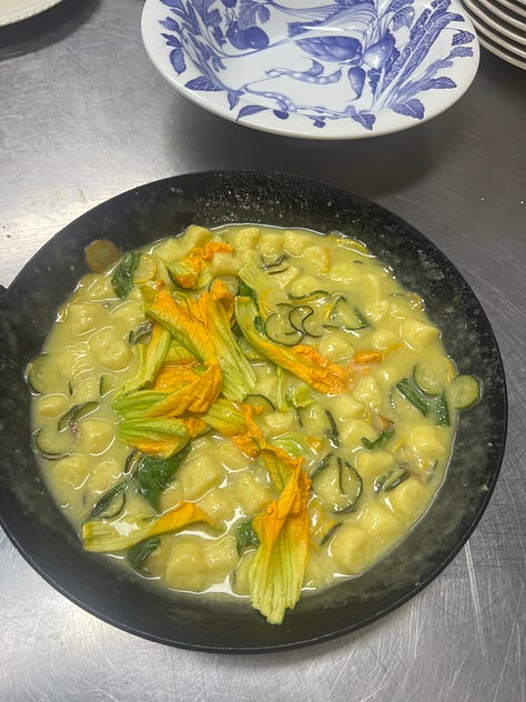 Tuesday night’s dinner consisted of a cucumber love boat filled with bagna cauda, a salad tumble with cow’s curd, courgette, and pesto. Gnochetti (baby gnocchi) with mussels, tomatoes and pecorino, the main pork neck cooked in fig leaf served with fresh corn polenta and salad. Finished with the jiggliest of peach jellies I was really on the edge of them completely collapsing which is exactly where I like to be and a ricciarelli for them to take home. I was quite jealous not to be sitting down experiencing the whole thing!