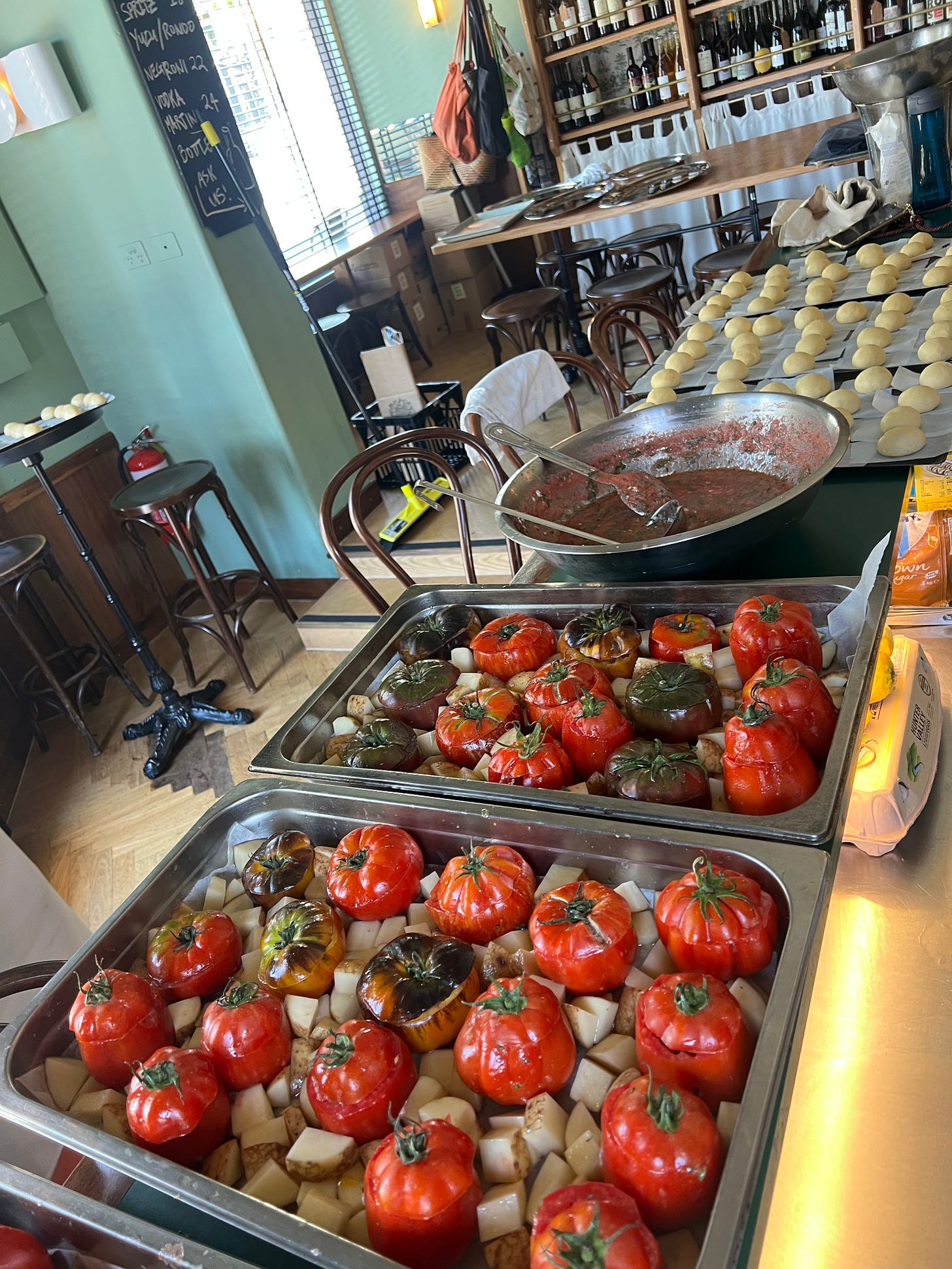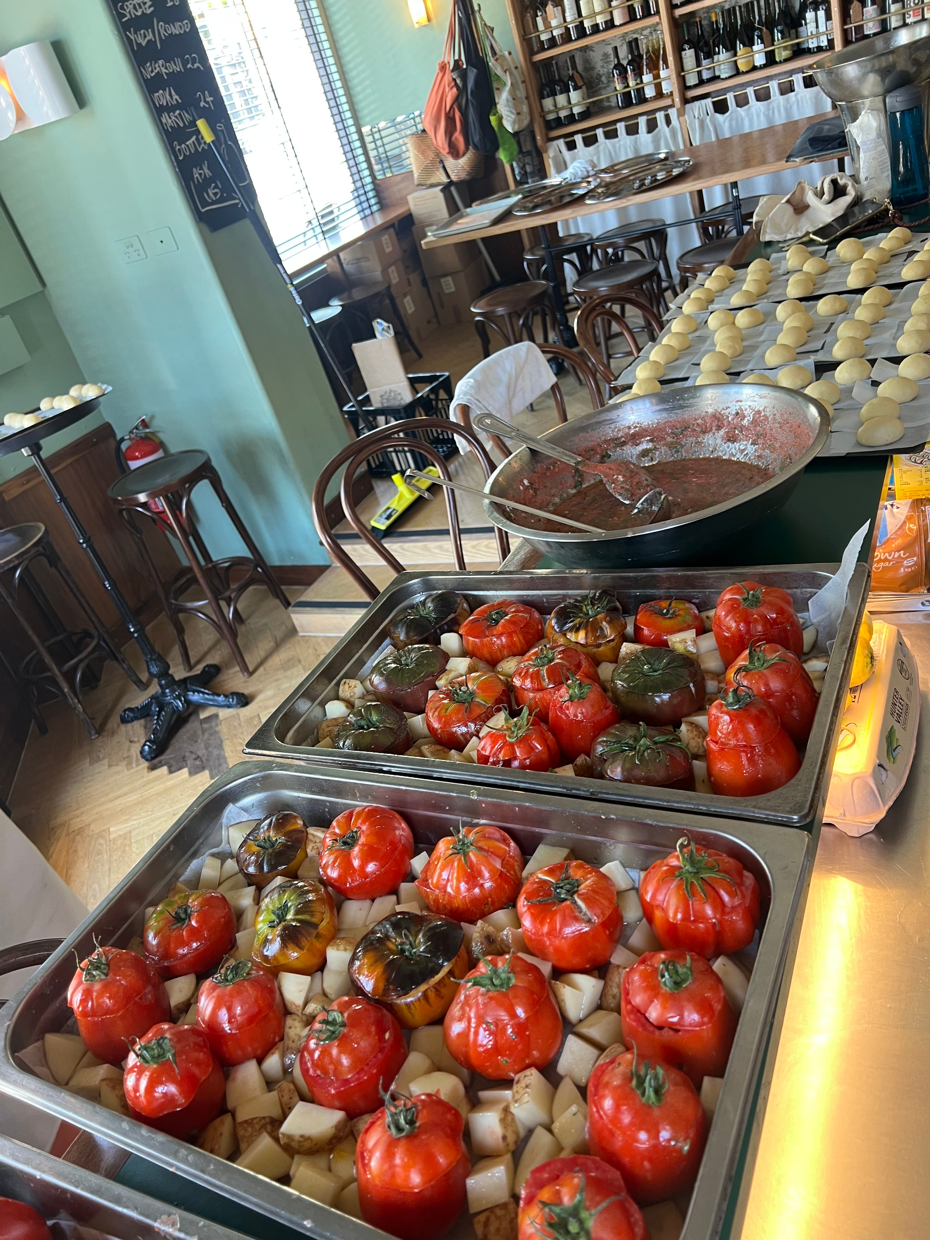 Our tour came to a perfect end on Sunday afternoon at Paradise bar where Georgia and I were joined by Laura from Towpath Café, London and Trish from Fratellli Paradiso in Sydney. We did a Tavola Calda, a buffet of gorgeous Italian style dishes including little anchovy butter buns, ratatouille, tomato rice, braised chicken leg and olives, finished with brown sugar custard filled bombolone and more cassata because why not. It was pumping from the get go, with wines being poured by lovely Trish from Gazzetta wines. A joyous time even in the sweltering heat.