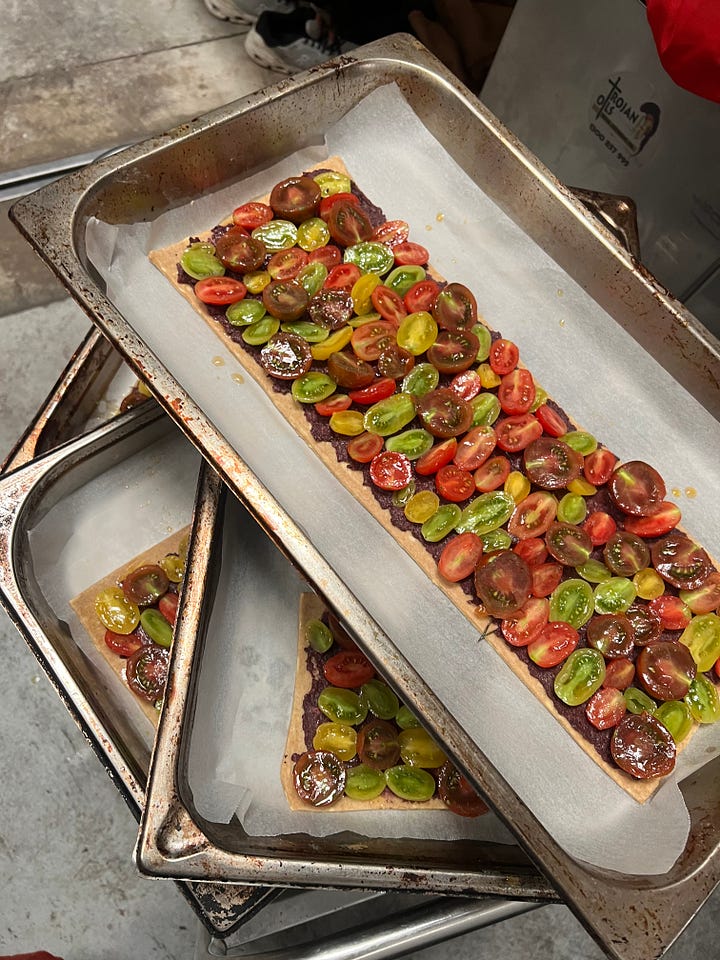 Then straight after the bake sale we hotfooted it off to start prepping at No. 7 Healesville in the beautiful Yarra valley. The wonderful team there made us feel very welcome, on the Sunday we served a feast starting with a nibble of tomato and olive tapenade tart made with wholegrain rough puff naturally and all the wonderful baby tomatoes which are currently popping off here. Then on to a salad of green beans, peaches and lardo, gnocchi alla nerano (lots of courgette, basil and cheese.) For mains there was garfish which are very long with pointy chins served with sauce vierge (tomatoes) and agretti.
