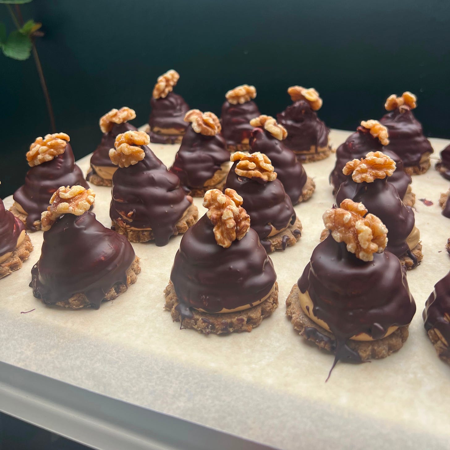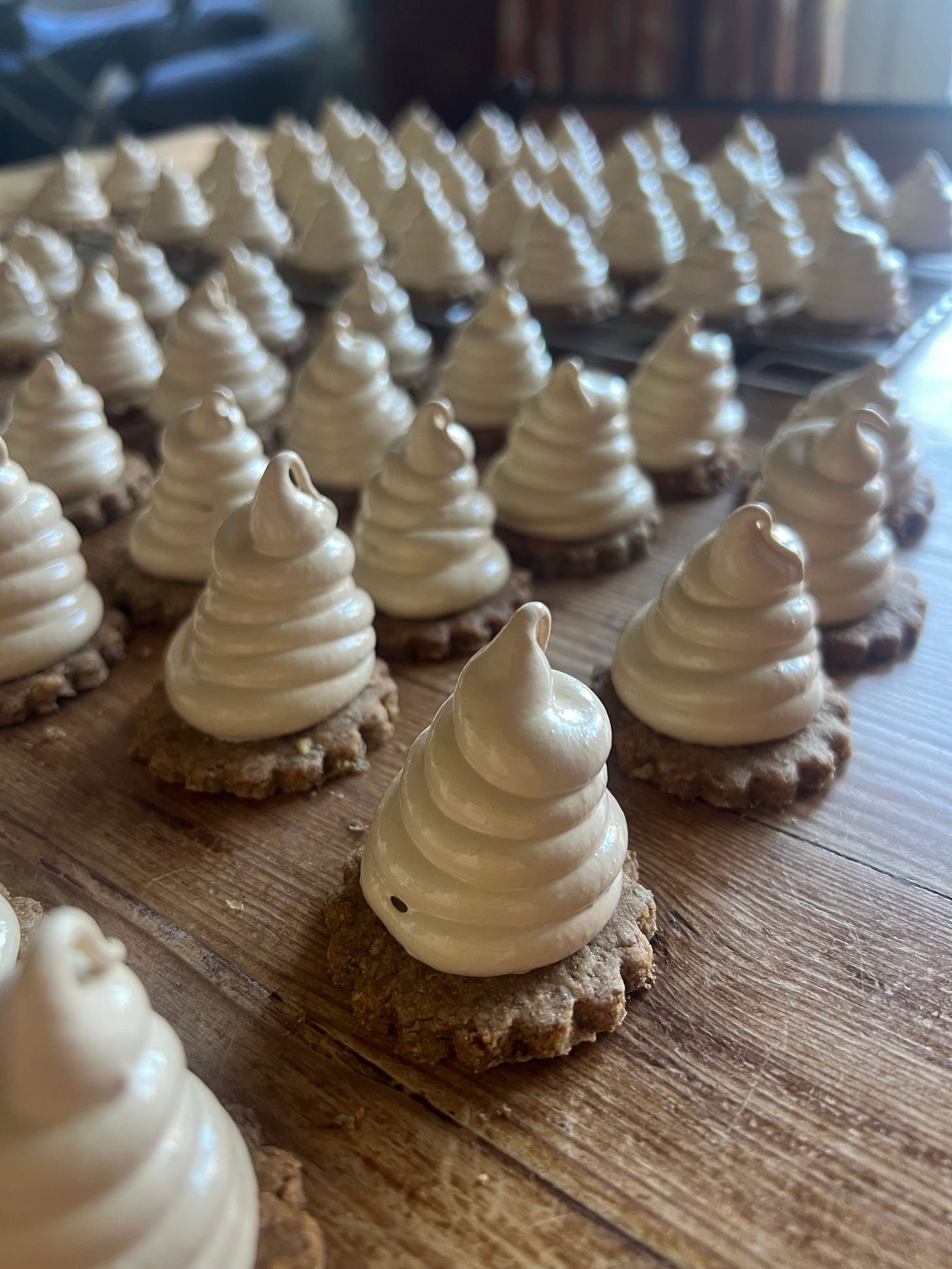 I have been working on the recipe for a while and have previously made Tea cakes, using a round dome mould which looked great but I could only make six at a time. I also made a hazelnut Wagon Wheel so going on to a Walnut whip was simple. The main excitement for me was creating the brown sugar marshmallow, I am of course very keen on all brown ingredients and I find white white marshmallow just tastes like a refined sugar toothache. Also in basically all the marshmallow recipes I looked at they used liquid glucose, now I feel very suspect of liquid glucose as it doesn’t seem very natural and I’m not really sure what on earth it is apart from being sweeeeeet and there supposedly to stabilise your sugar. I just didn’t use it and had zero issues so decided it was surplus to requirement. My whip is brown sugar marshmallow piped on to a rye and walnut biscuit and covered in dark chocolate topped with walnut. This recipe is a project, it’s not a quick one to whip up and definitely got some more advanced skills but good if you have a thermometer and fancy a challenge.
