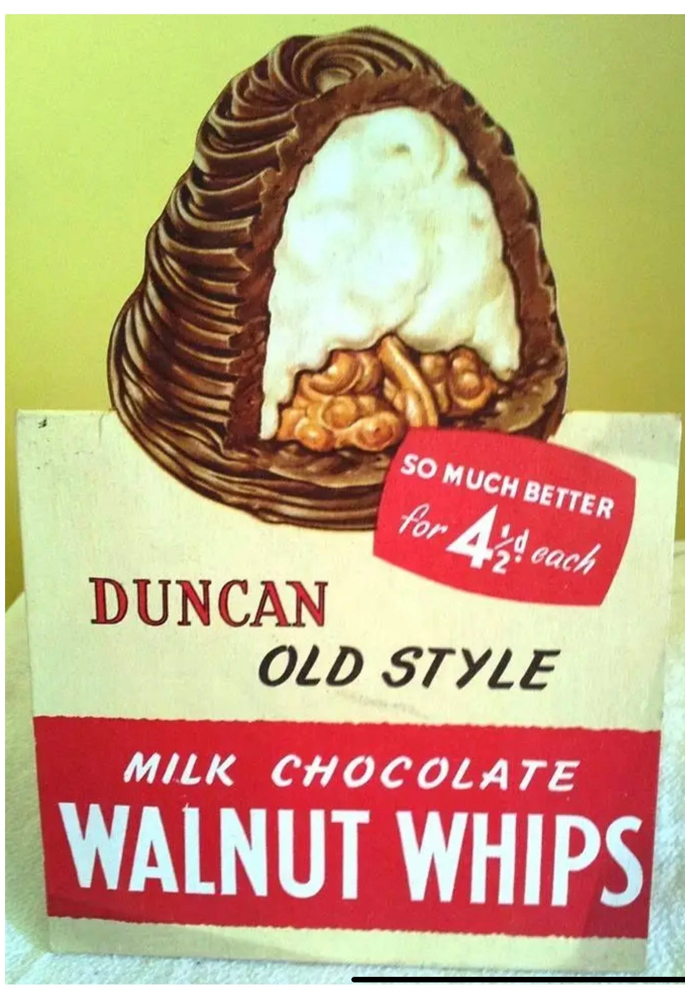 The Walnut Whip was launched in 1910 by Duncans of Edinburgh who later got renamed Rowntree’s who are owned by Nestle. The original was a milk chocolate shell filled with airy vanilla fondant (not entirely sure what this is, but has definite marshmallow qualities) and the walnut which started off hidden inside the shell rather than sitting jauntily on top. I think as an item it just feels whimsical, I took some to my lovely accountant and she was immediately filled with joy and exclaimed in her Scottish accent “What a treat. My mother used to buy us one every Sunday!” The whip has been through some variations and some different flavours chucked in, even one without any walnut at all which feels wrong. It is claimed that a walnut whip is eaten in the UK every 2 seconds which seems mental!