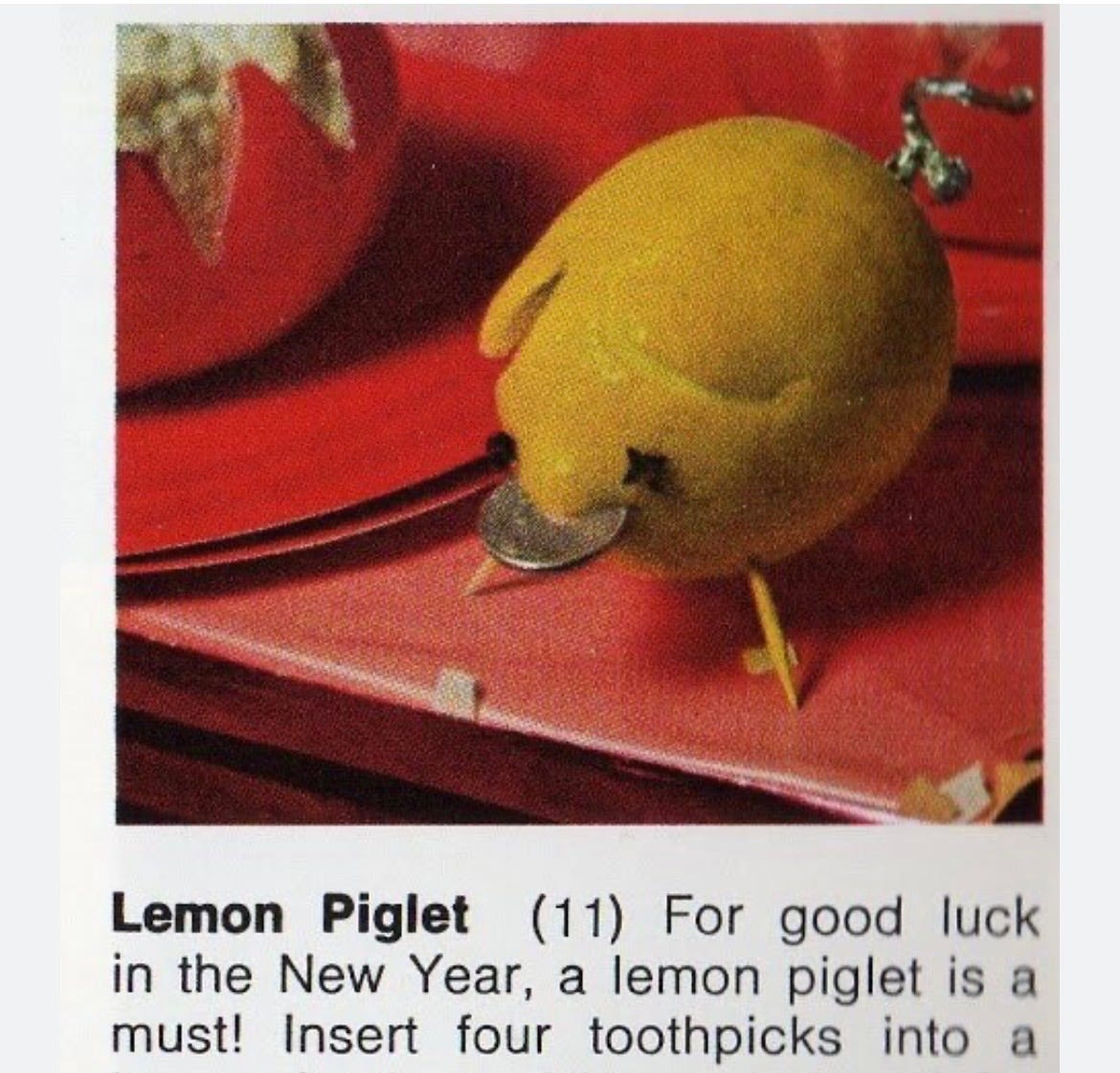 As it is New year’s Eve and we are discussing citrus I must bring up the lemon pig, a symbol of good luck for the new year. Lemon pigs have had a bit of a comeback in recent years, before that they had a surge in the 1970’s but were originally seen in 1890’s as a craft project for children, the luck part came later. In the Chinese zodiac the pig is a symbol of wealth and good fortune and of course they are pretty darn charming.