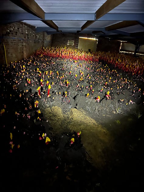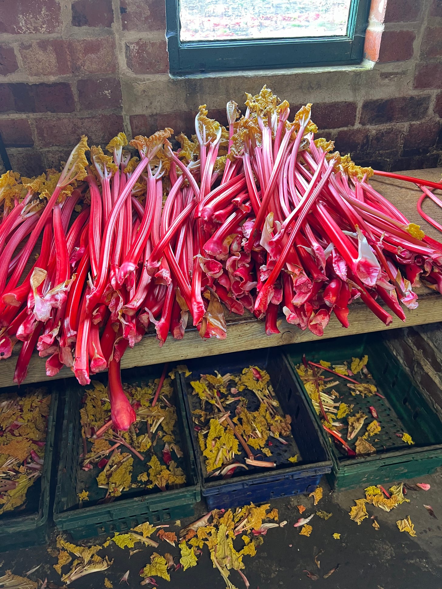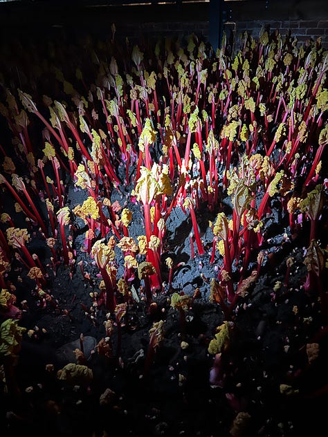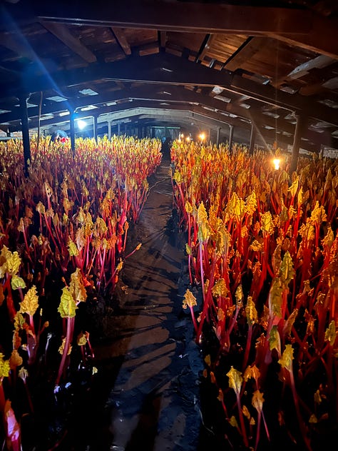 This week we are in the throes of forced rhubarb. At Leila’s we get amazing rhubarb from Cooks, a couple of years ago Leila and I had the pleasure of visiting the farm, we went up for the day, it was very easy on the train to Wakefield. We were welcomed with ham baps and strong cups of Yorkshire tea and then plunged into the darkness of the rhubarb sheds!